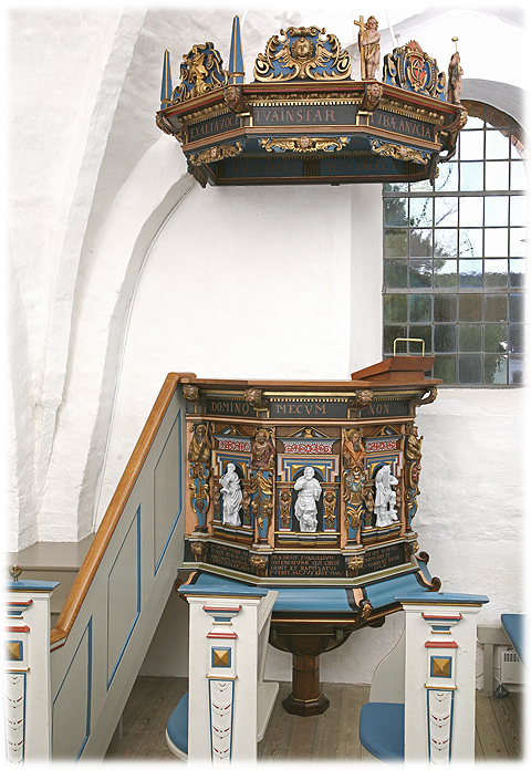 efter restaurering i 2008. Prædikestolen er i renæssance